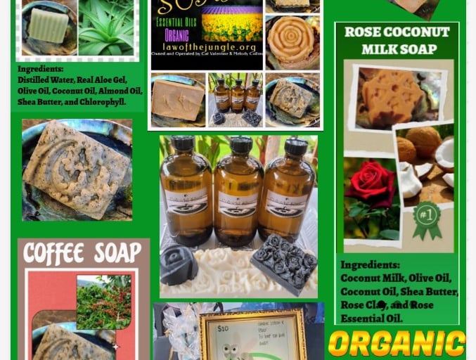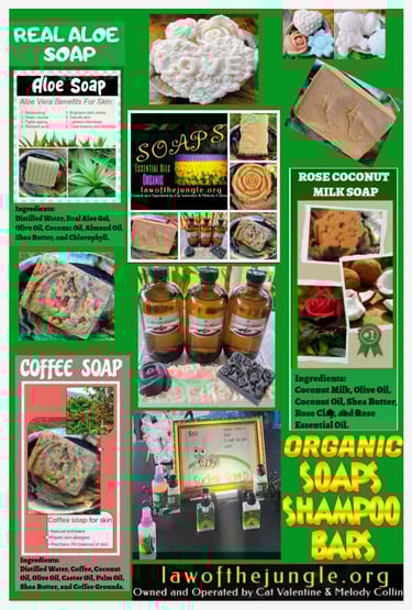 Welcome to Law Of The Jungle Organic Soaps and Shampoo Bars Company! You will only find the Finest Organic Oils and Essential Oils in their Soaps! The colors are naturally derived from the Chlorophyll, Turmeric, Activated Coconut Charcoal, or Clays, depending on the Bar. They Never use toxic Micas or Fragrance oils! Only the Best for your Skin and Health benefits! For local pickup, please contact Cat at cat6825@proton.me for availability! Meet the Owners of Law of the Jungle Organic Soaps and Shampoo Bars Company! Cat Valentine, who has been a Professional Musician/Singer since the age of 17, and Melody Collins, an extremely well-versed Holistic Creator, Wife, and Homemaker! They couldn't find an Organic Soap anywhere! Not even in Heath Food stores! So, the two of them set out to make their own, having no idea that it would turn into a business! Pretty soon there were over 20 varieties, all with their own individual healing and nourishing properties! The 'Rose Coconut Milk Shampoo Bars' are fast becoming a hit! Any hair type, with no after care or products. When you begin using this Bar, there will no longer be hair loss. Essential Oils are from Nature. Fragrance Oils are synthetic and mess with our Endocrine System. There is a reason why people hold onto the weight on their bodies even after working out and eating/drinking good. Commercial Soap products contain 'Forever Chemicals', and they are stored in our fat cells, as our bodies have no use for them! Coconut Oil is a natural SPF 35. It is in every one of their bars! Your skin will be nourished. The Real Aloe Bar is fantastic after a day in the sun! The Tea-Tree Chlorophyll Soap will heal skin issues. The Rose Coconut Milk Bar removes wrinkles and firms skin. Read the reviews! 'Law of the Jungle' Organic Soaps is a place where you can trust that what you purchase from them will be a top-notch and wonderful Product! You can also purchase Soaps from Cat at her shows, which can be found on her website, catvalentine.net! Below is a Live Testimonial and Reviews from our customers!
